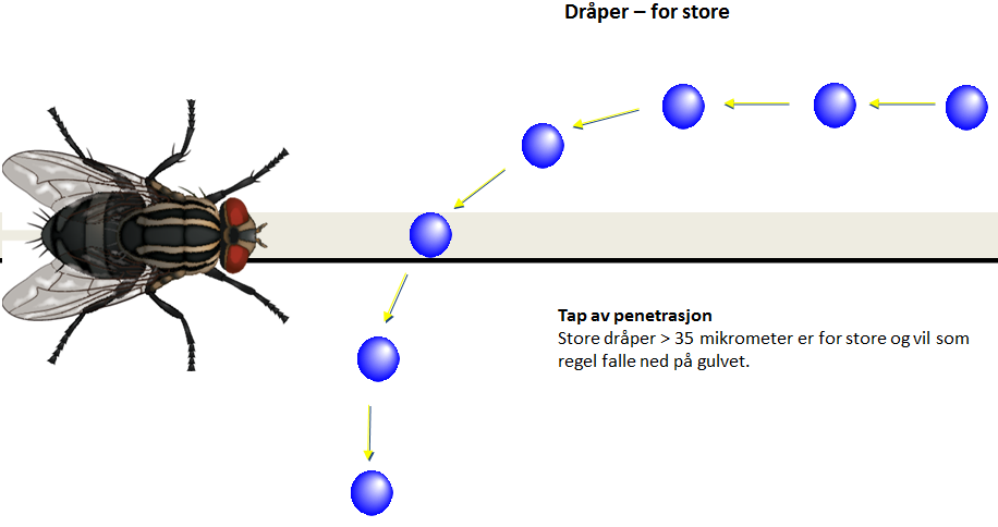 Dråper som er større enn 35 mikrometer, er mindre effektive, siden de ikke vil holde seg i